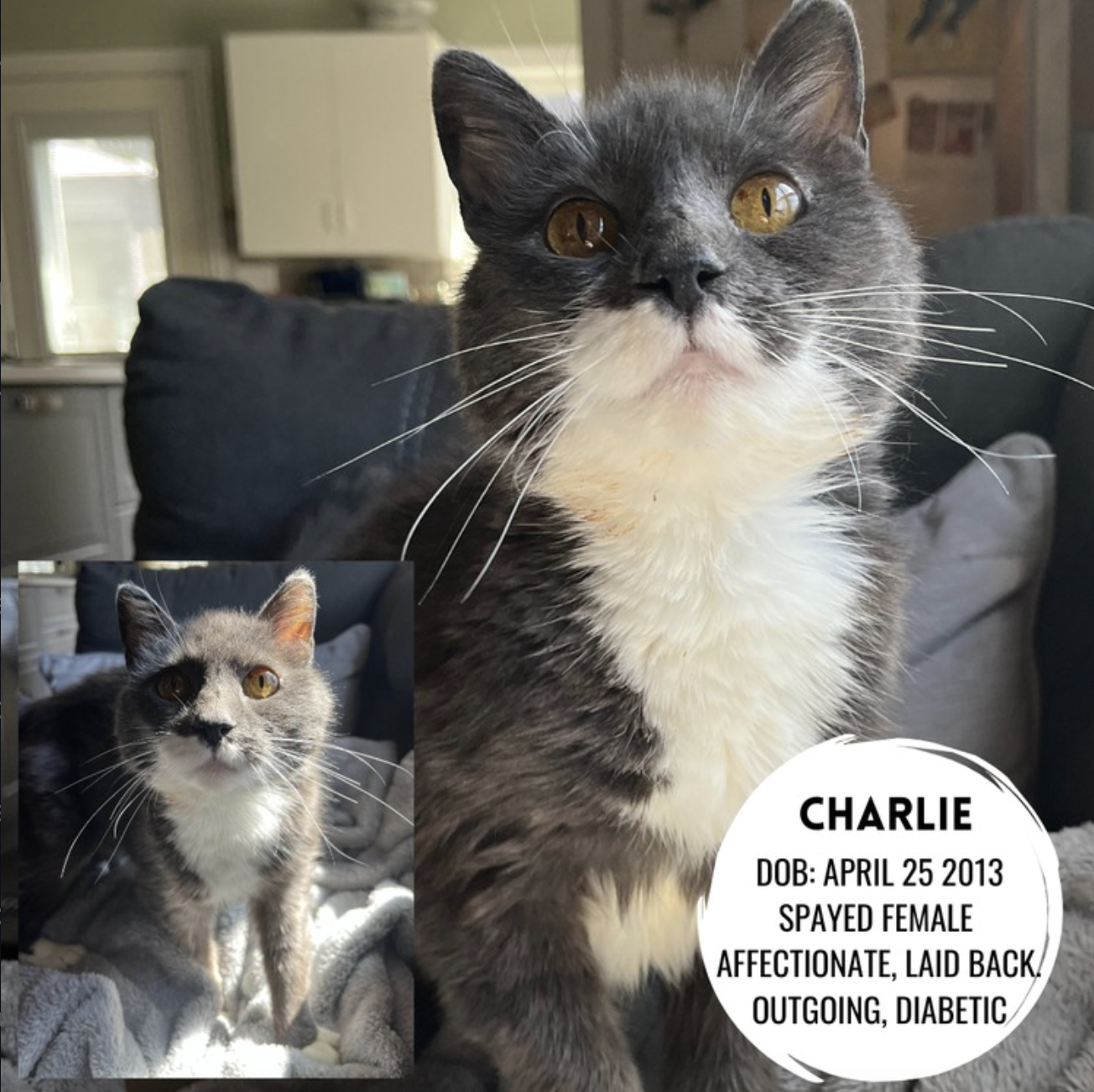 Charlie has diabetes, which means she needs insulin shots twice a day for the remainder of her life, but she handles them like a champ. Her condition is well-managed, and she has made amazing progress. She will need to remain on diabetic food as well for the remainder of her life.