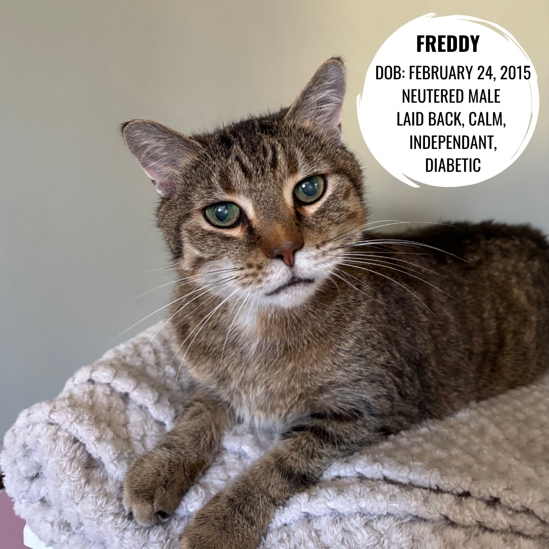 Freddy is diabetic and will require ongoing veterinary care and routine management to keep him feeling his best. He is also declawed. With the right home and a dedicated adopter, Freddy will make a loyal, one-person companion who brings plenty of character and charm.