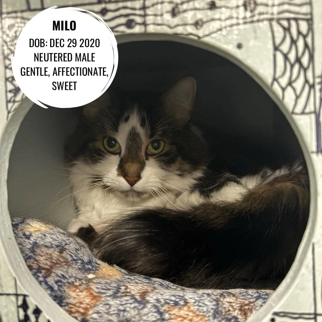 Meet Milo! Milo is a gentle soul who loves spending his days relaxing and snuggling with volunteers. He’s a very sweet boy with a calm, affectionate nature. Milo will need a special home that can monitor him closely, as he has had three abdominal surgeries after ingesting toys and plastic. For his safety, he would do best in a home without young children and in an environment free of items he might ingest.