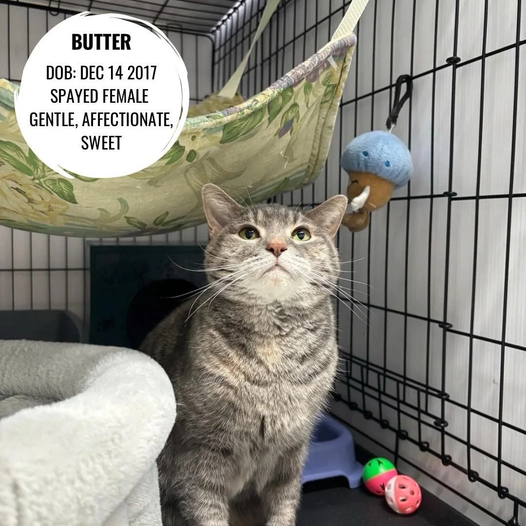 Meet Butter! Butter is a gentle, quiet older girl who may be a little shy at first, but once she trusts you, she’s incredibly affectionate. She has a calm, laid-back personality and loves relaxing in cozy spots. Her favorite things are bum pats and cheek rubs, and she’ll happily soak up your love once she feels safe. Butter would be perfect for someone looking for a sweet, peaceful companion.